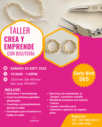 Aprende a crear pantallas alambradas con perlas, descubre cómo monetizar tus piezas y llévate un workbook exclusivo con estrategias, suplidores y un plan claro para comenzar a generar dinero extra.